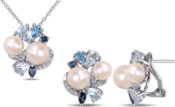 Cultured pearls add an air of elegance to this earring and necklace set featuring created white sapphire and blue topaz for an extra dose of shine.
