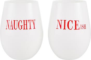 Sip your favorite vino with a friend in naughty-and-nice style with this set of glass tumblers.