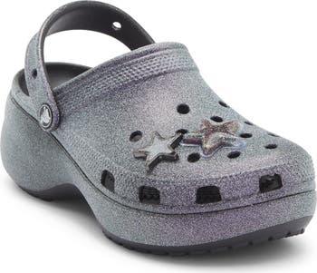 The iconic silhouette of a lightweight, water-friendly clog is featured in a allover glitter and iridescent finish for a pearlescent appeal that makes any outfit shine.