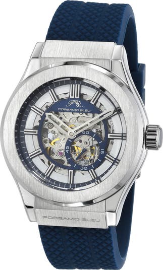 Exposed gears bring intrigue to the dial of this stainless-steel watch complete with a silicone band for all-day comfort.