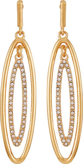 These polished earrings plated in gold suspend linear drops that are shimmering with crystals.