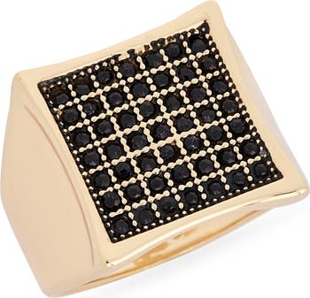 This bold signet ring adorned with faceted black crystals brings subtle luster to any look.