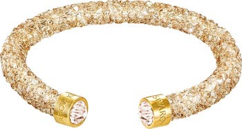 Crafted using our Crystal Rock technique, the irresistible Crystaldust Cuff is a new signature Swarovski design to equal Stardust and Slake. It is lavishly encrusted with golden toned crystals for unparalleled sparkle. Its open-shank silhouette is on-trend and comfortable, whilst the gold PVD metal capped ends, embellished with crystals, finish its clean design perfectly. Wear alone as a perfect finishing touch or layer with others for maximum impact.
