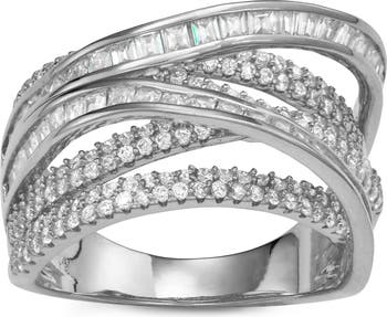 Twinkling round- and princess-cut cubic zirconia dust a statement-making ring that shines in silvertone plating.