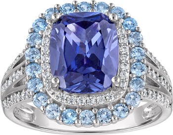 White and blue cubic zirconia create a colorful display atop a polished ring crafted from icy sterling silver.