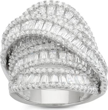 Sparkly baguette- and round-cut cubic zirconia illuminate this glamorous multiband ring in polished silvertone plating.