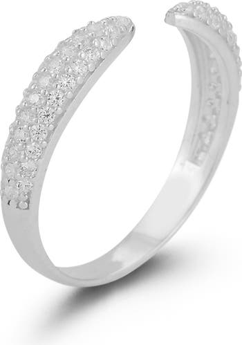 The open-ended design brings a modern look to this sterling silver ring plated in rhodium alight with pavé cubic zirconia.