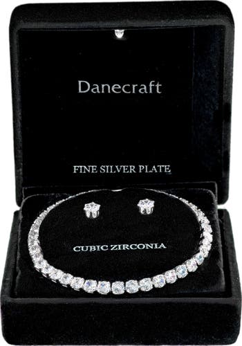 A matching set of stud earrings and a tennis bracelet are shimmering with faceted cubic zirconia to bring elegant sparkle to any look.