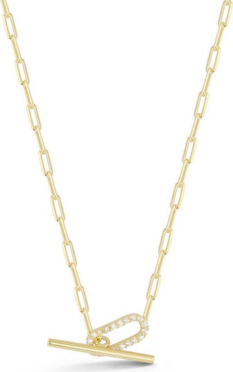 A front toggle traced by sparkly cubic zirconia illuminates this paper clip–chain necklace crafted from sterling silver and plated in warm 14-karat gold.