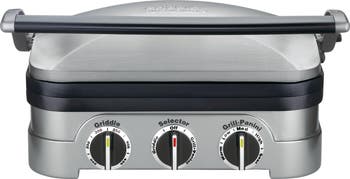 What it does: With five separate cooking options, the Cuisinart® Griddler can handle everything from pancakes and sausages to grilled cheese to steaks, hamburgers and panini. A floating cover and one set of reversible plates turn the Griddler into a contact grill, panini press, full grill, full griddle or half grill/half griddle. Dual temperature controls ensure everything is perfectly cooked every time. The removable nonstick cooking plates are dishwasher safe for easy clean up.