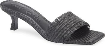 A fraying strap woven from faux raffia brings a beach-goth aesthetic to this slide sandal framed by a square toe and comma-kitten heel.