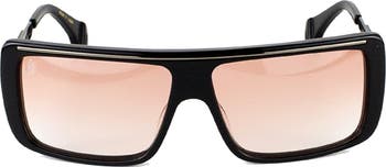 Bold rectangular frames modernize the look of sporty sunglasses fitted with gradient lenses.