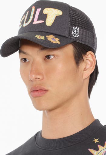 Stay shaded in cult-worthy style with this trucker hat featuring a hand drawn logo and mesh back panels.