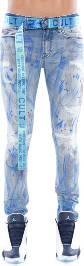 Paint smears and threadbare distressing define these belted jeans cut from premium stretch denim in a contour-hugging fit.