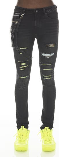 These dark-wash jeans sport a low-rise, super-skinny fit and premium stretch denim that featured crystal-encrusted patches peeking through the slashed rips.