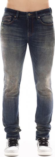 Slim-fitting stretch jeans feature a dimensional dark wash, subtle distressing and signature stitching at the back leg for an everyday edgy look.