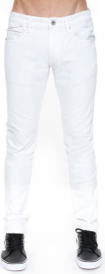 Cotton denim means a supreme fit in modern streetwear jeans updated in a stark white with subtle red stitching details.