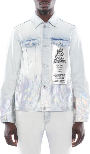 An oversized 'XX' graphic details the back of this classic trucker jacket crafted from premium nonstretch denim with an allover iridescent appliqué.