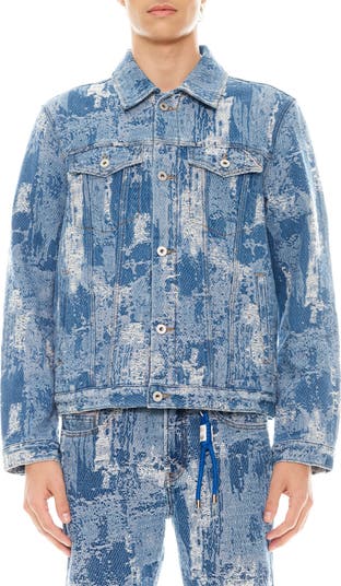 An intricate digital camo print adds bold, statement-making style to this heavyweight-denim trucker jacket.