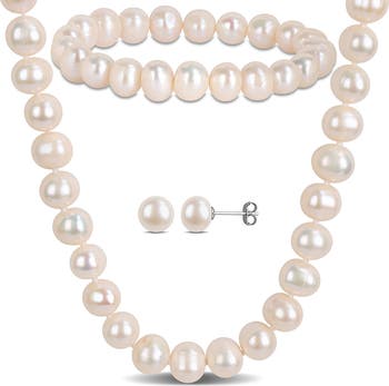 Show off sophisticated shine with this matching three-piece set including a freshwater pearl necklace, stretch bracelet and earrings.