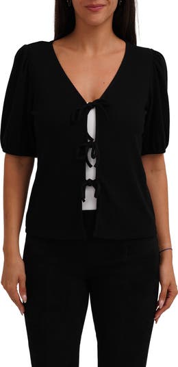 Dainty front ties tether this lightweight ribbed top framed by gently puffed sleeves for charming style.