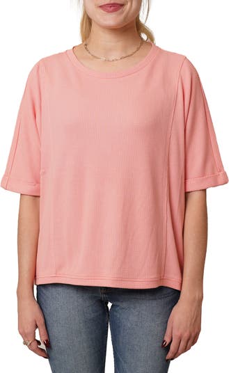Perfect for your off-duty ensembles, this comfortable waffle-knit top features elbow-length sleeves and a crewneck.