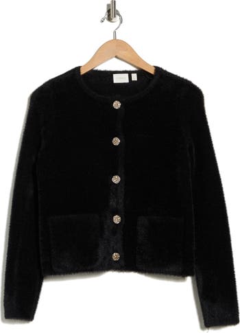 A row of polished buttons secure the placket of a layer-loving cardigan knit with an eyelash texture for a fun flourish to casual looks.
