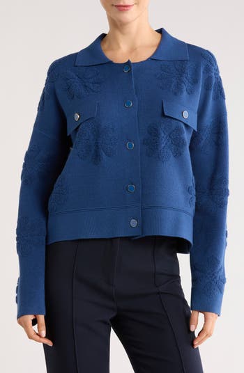 Textured flowers bring retro charm to this comfortably relaxed sweater-jacket framed by a spread collar and utility-inspired pockets.