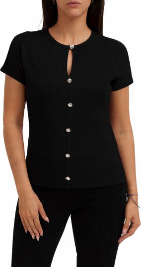 Hammered metal buttons trim the front of this ribbed-to-fit top detailed with a sweet keyhole at the front neckline.