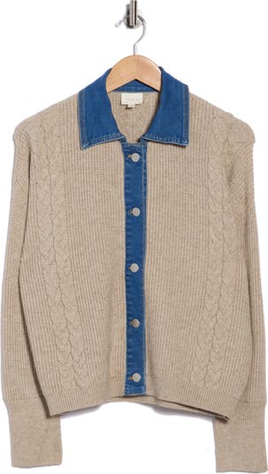 Bring an industrial touch to your cold-weather looks with this button-up sweater finished with cable stitches and trimmed with denim.