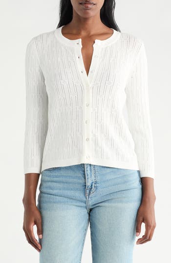 Open stitchwork sweetens a lightweight button-up shirt framed with elbow-length sleeves and a crewneck.