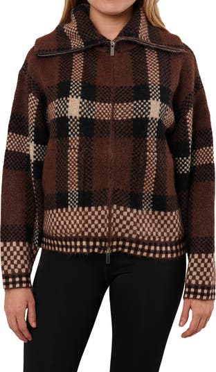A bold plaid pattern enhances the cabin-inspired charm of a warm knit jacket outfitted with deep, hand-warming pockets, a wide collar and a front zip closure.