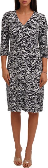Perfect for any occasion, this printed rib-textured knit dress features three-quarter length sleeves and a charming front twist detail to subtly define a shift silhouette.