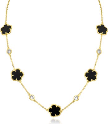 An elegant goldtone necklace showcases black clover stations and bezel-set cubic zirconia for eye-catching shine.