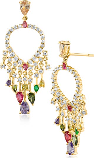 - 18K gold plated CZ embellished multicolored open front-facing teardrop chandelier earrings