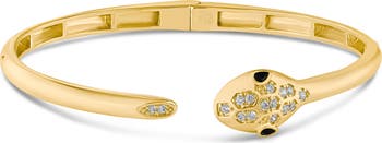 Pavé white and black cubic zirconia stones detail the snake head and tail of this hinged bracelet that wraps around your wrist.