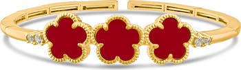Show off a pretty pop of color with this flexible cuff bracelet boasting a trio of red stone clovers accented by sparkling cubic zirconia.