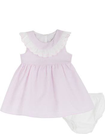 Baby will look darling in this striped dress styled with a frilly embroidered collar and matching bloomers.