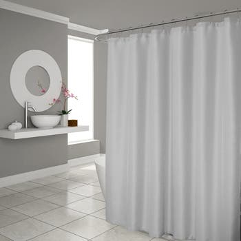 A waffle texture distinguishes a shower curtain that adds an element of understated elegance to your bathroom.