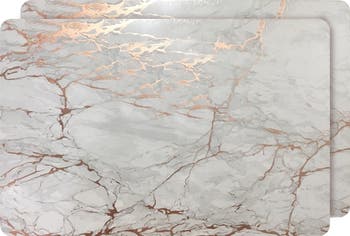 Bring the perfect blend of design and durability to your tablescape with this set of placements crafted from cork and marbled vinyl.