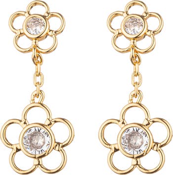 Bezel-set round-cut cubic zirconia stones fill the center of each daisy flower of these drop earrings that's rendered in warm goldtone plate.