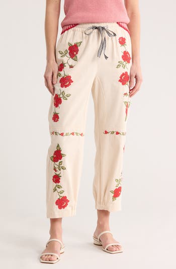 A garden of embroidered flowers blooms on the front of these pull-on pants made from soft breathable cotton.