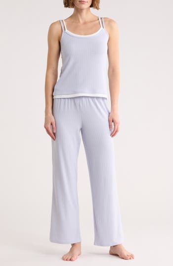 Slumber soundly or simply lounge in the soft, stretchy comfort of these layered-illusion pajamas featuring a camisole-style top and matching straight-leg pants.