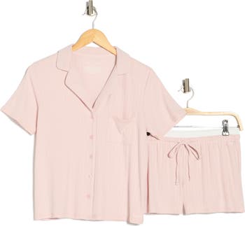 Drift off to dreamland in this comfy pajama set including a short-sleeve button-up shirt and matching shorts cut from a variegated ribbed knit.