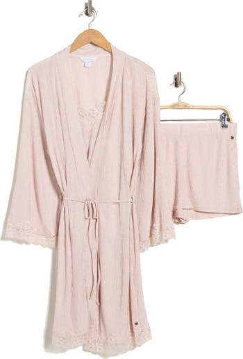 Scalloped lace and a softly shimmering finish bring ultimate romance to this finely pleated pajama set complete with a robe, a camisole and a pair of matching shorts.