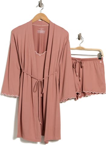Lounge or snooze in the comfort of this soft jersey pajama set including a wrap robe, camisole and shorts edged by scalloped embroidery.