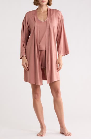 Lounge or snooze in the comfort of this soft jersey pajama set including a wrap robe, camisole and shorts edged by scalloped embroidery.