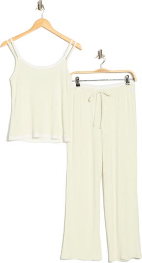 Lounge or snooze in this soft ribbed pajama set including a strappy faux-layered camisole and pants fashioned with a mock double-waistband.