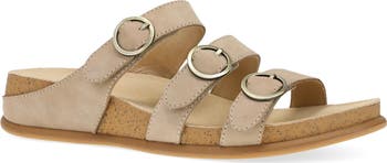 A trio of adjustable straps offer a customized fit on a nubuck leather slide sandal lifted by a slight platform and modest wedge heel.