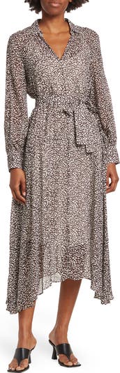 Slip into style with this midi dress with a tied waistline and asymmetrical hem for movement and flow.